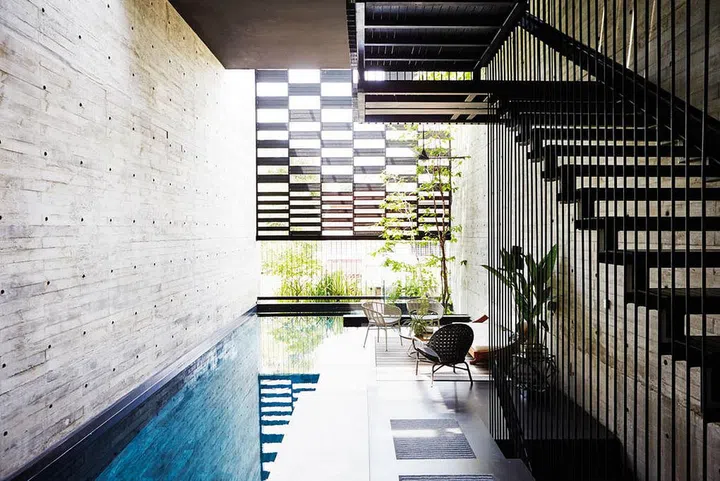 Being outdoor-lovers, the couple had the home designed to be completely naturally ventilated, without any glass windows on the facade. For the staircase, they chose black powder-coated steel beams to complement the interior look.