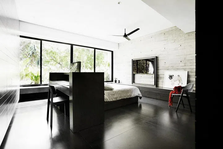 Natural light illuminates the master bedroom, with windows that span the entire length of the east-facing facade. To keep the colour scheme of the room consistent with the rest of the house, they chose large pieces of Black Metal tile from GF+A.