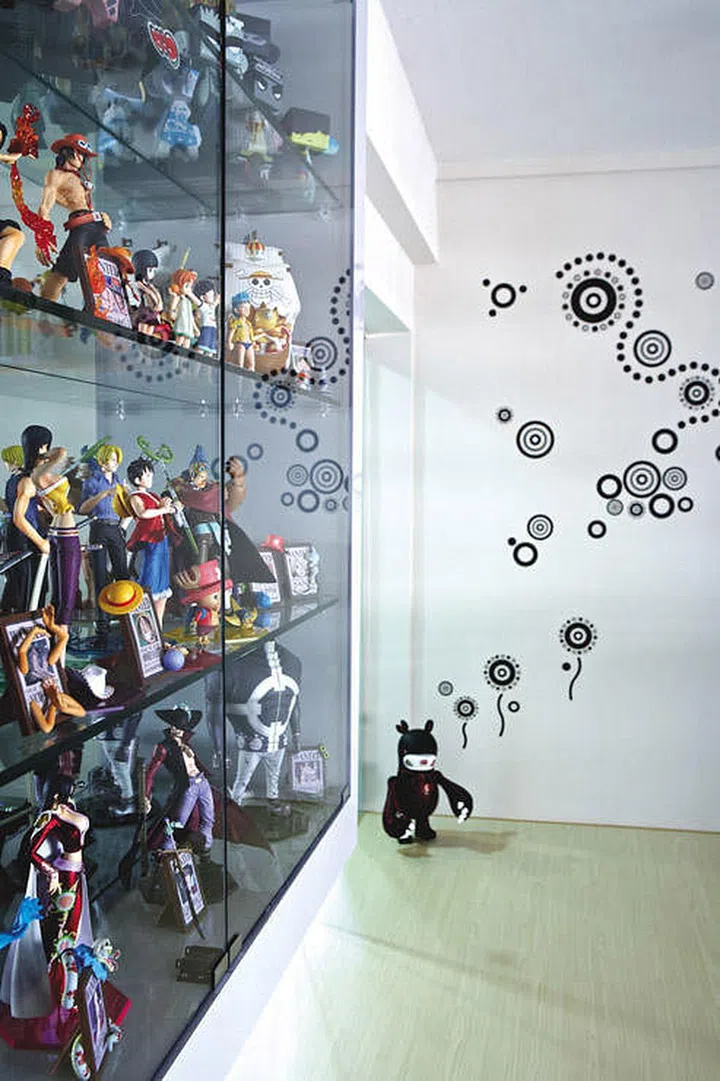 Colourful figurines from the One Piece manga are all this space needs to lift the moderate colour scheme.