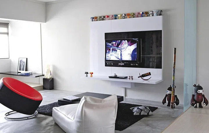 The TV feature wall recedes into the white concrete wall, allowing the kooky Mad*l figurines above to steal the spotlight.