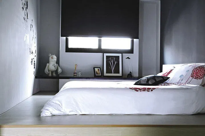 Graphic black decals bought in Malaysia embellish the master bedroom. The entire master bedroom floor has been raised with a platform, with the bedhead fixed to the wall.