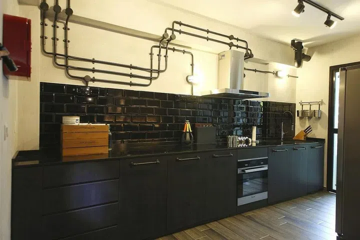Masculine and sleek, the monochromatic kitchen boasts a backsplash of subway tiles and exposed piping that conceals lighting cables.