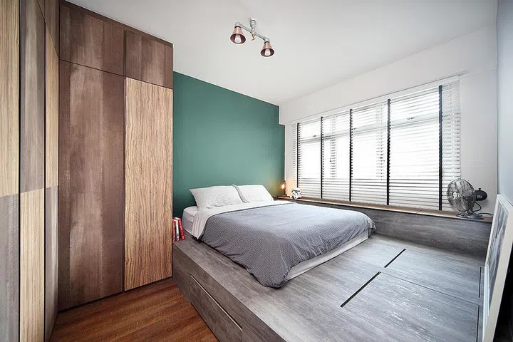 Stretching across the width of the bedroom is platform, done up in concrete-screed-lookalike laminate that hides several storage compartments. Floor-to-ceiling wardrobes, which occupy two adjacent walls, offer more storage space.