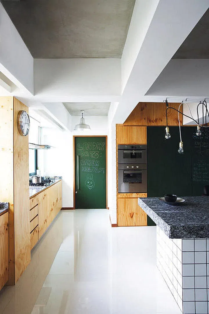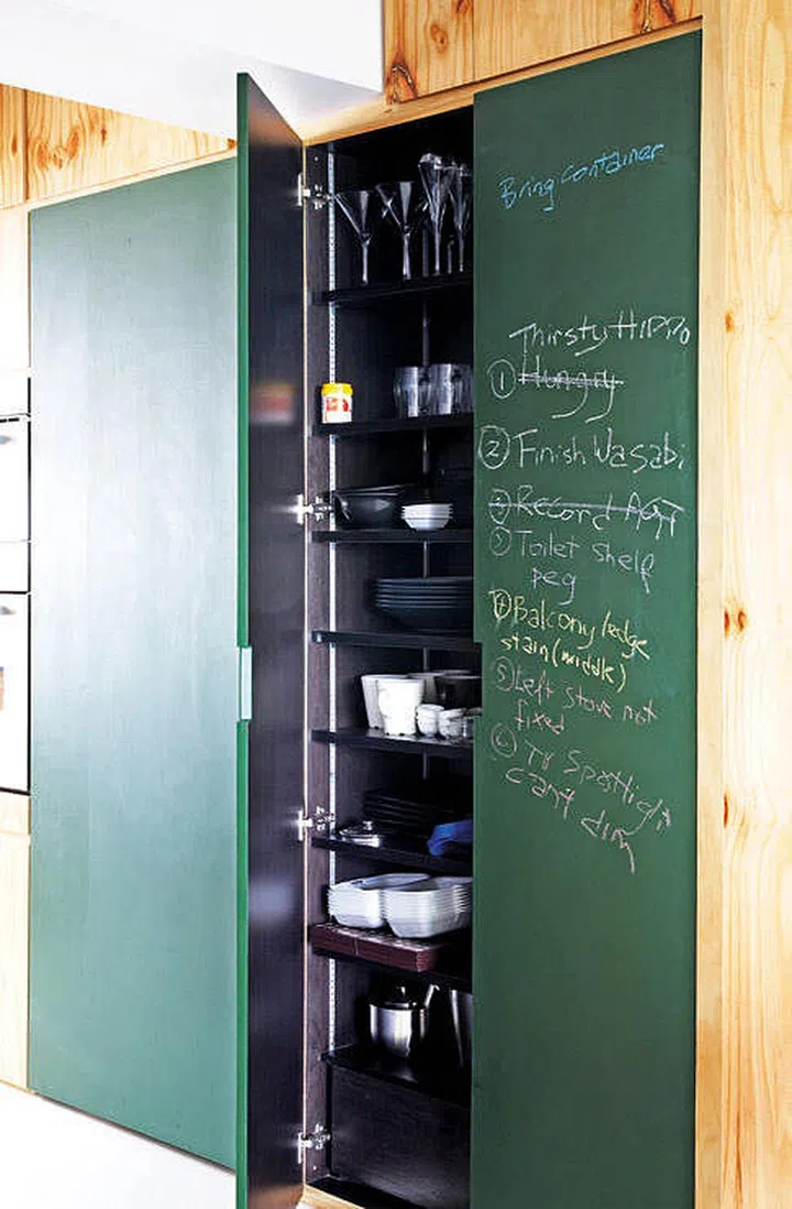 Hidden behind the green chalkboard push-to-open flush doors are the owner’s tableware.