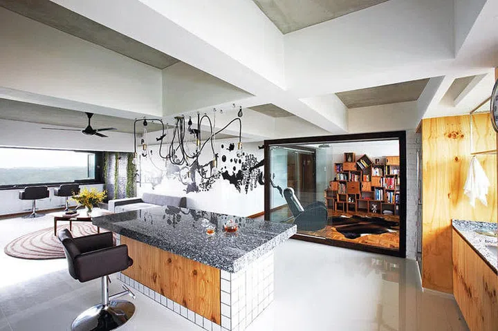 The black-framed glass panel allows more light to penetrate the study and its adjacent spaces. The wood tones of the study room floors also warm up the cool white of the living room area.