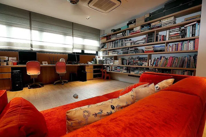 Book-filled shelves line a wall of this communal space on the second level, where the kids play or have tuition.