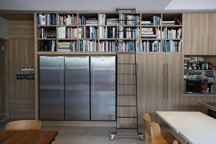 An open-concept kitchen, which was designed by Mr Stroobant, is next to it. It is the heart of the house, where the family have dinner or entertain friends at least once a month. It is a homely space, with wood panelling and cookbooks placed on shelves above the three fridges - these can be accessed with a ladder on wheels.