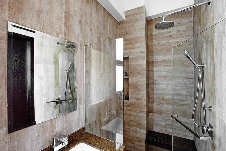 The footprint of the master bathroom was reduced, but glass panels and hollowed-out niches for toiletries keep it looking spacious and neat.