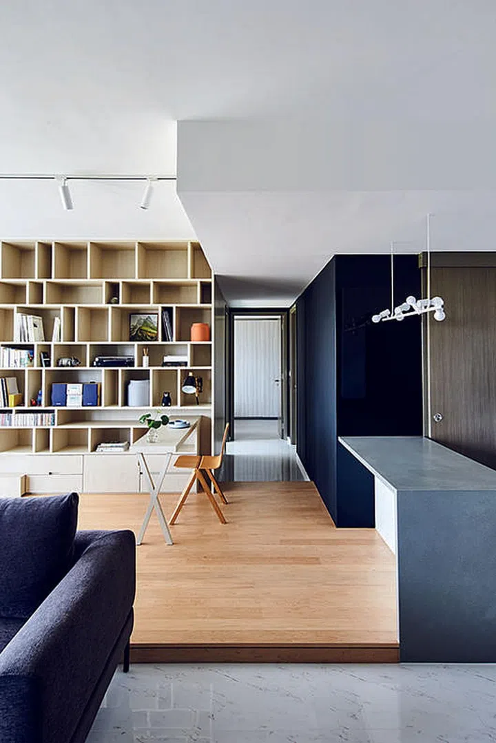 The couple of this 1,184 sqf, three-bedroom executive condominium unit in Tampines Central wanted neutral wood tones and a “sophisticated, chic look”. So their designer Kelvin Lim of Atelier Here translated those specifications into spaces featuring minimalist forms and details, with a colour palette of black and light wood details.