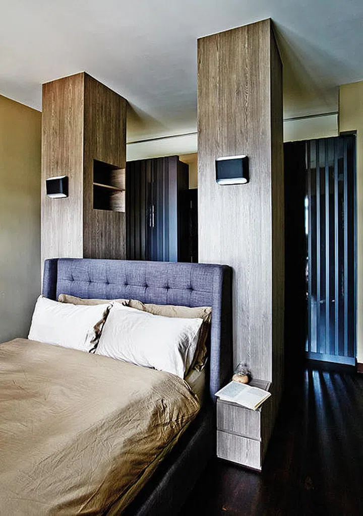 For a simple feature wall that backdrops the bed and integrates ledges as bedside tables, Kelvin used raw plywood, and selected panels in a darker, reddish hue to give the bedroom warmth.
