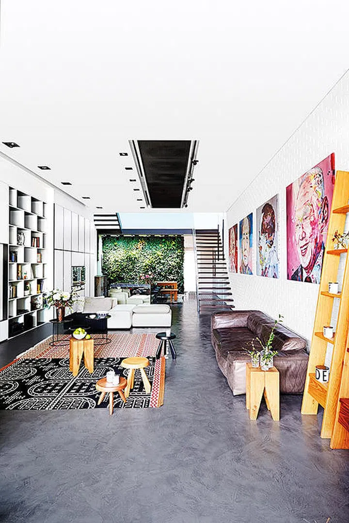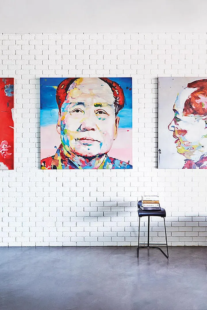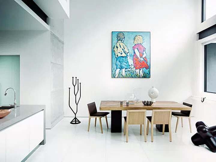 Large vividly coloured paintings and a white brick treatment prevent this large expanse of wall from looking stark.