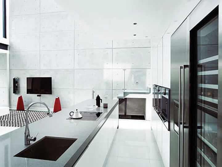While keeping to the contemporary palette of grey and white, the dry kitchen plays with varying finishes (from the glossy cabinets to the stainless steel built-in appliances) to circumvent a one-dimensional look.