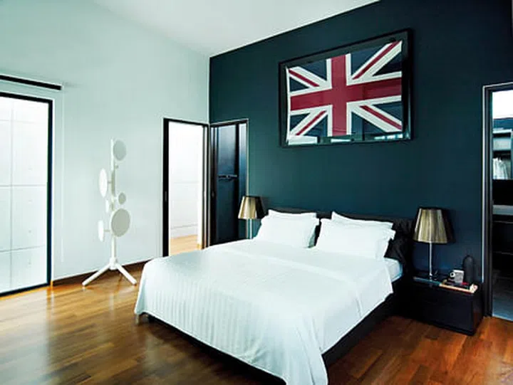 Elvin opted for warmer tones in the bedroom. Unlike the rest of the residence, this personal space sports dark wooden floors and a charcoal-black accent wall, personalised with a Union Flag and a quirky coat stand by Tom Dixon.