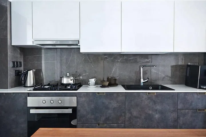 The clean-cut kitchen features a countertop made with environmentally friendly wood-look Kompacktplus.