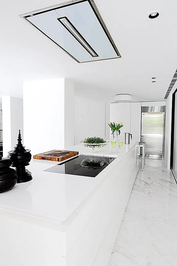 Customised wall storage units here and throughout the apartment are concealed by doors wrapped with a polyurethane finishing to minimise joint lines for a cleaner look.