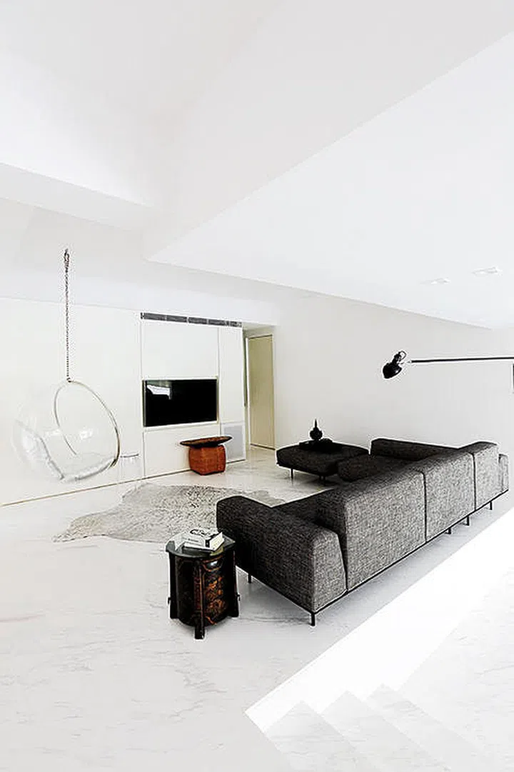 The wife loves furnishings that are visually light, such as the see-through Bubble Chair by Eero Aarnio that beckons guests to the television zone.