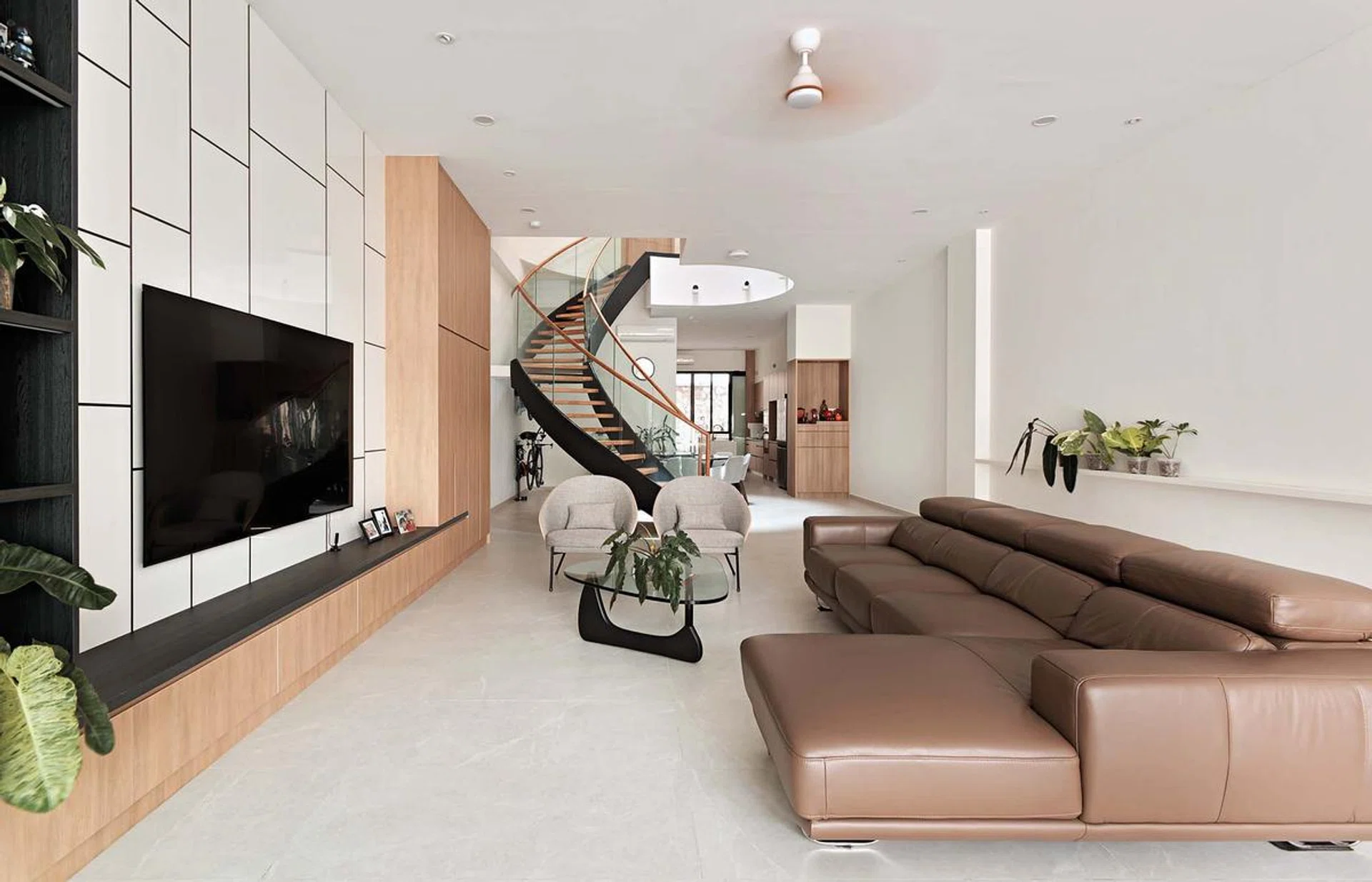 Apart from allowing natural light into the centre of the home, the circular courtyard void also serves a passive design purpose. By facilitating the rising of warm air to the top and channelling in fresh air from the lower levels, it creates a stack effect that promotes natural ventilation.