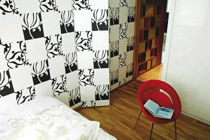 And push-open doors can easily be concealed with the help of decorative wallpaper like this.