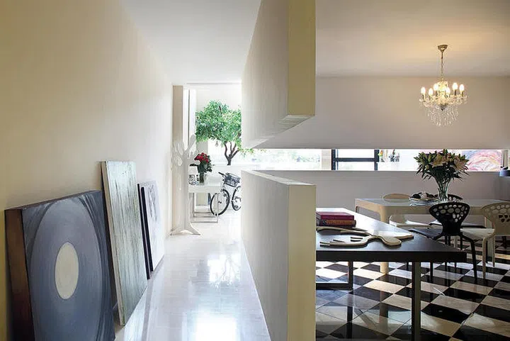 The walkway leading to this HDB flat’s bedrooms is separated from the living room with a swinging door that blends into the TV feature wall when closed.