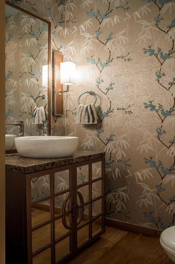 This style extends to the powder room where a blue-andbronze sakura blossom wallpaper, and mirrored cabinetry, were paired for a luxurious ambience. “We wanted an elegant surprise effect upon entering, with the idea to create a soft-toned jewellery box,” shares the Design Intervention team. See more of the home here.