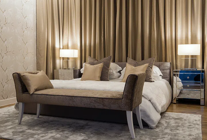 The master bedroom is a restful oasis decked out in earthy tones. A clever use of materials keeps it looking opulent. The furniture is mirror-clad; heavy blackout curtains with a metallic sheen create an intimate setting; while the gleaming and a faux fur bed throw provide plush comfort. See more of the home here.
