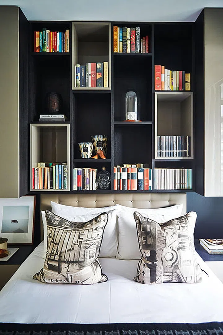 INSPIRATION: This guest room has a bookshelf as a “headboard” – the volumes on display add to the cosiness and personality of the space.
