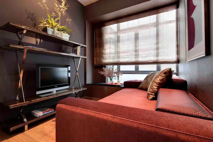 Here, Cameron Woo Design’s intent was to create a private retreat for the TV room in this penthouse apartment. The client’s functional brief was to create a room suitable for private television viewing and also double up as a guest overnight bedroom if the occasion arose, which lends the room to have a darker, masculine yet contemporary vibe to it.