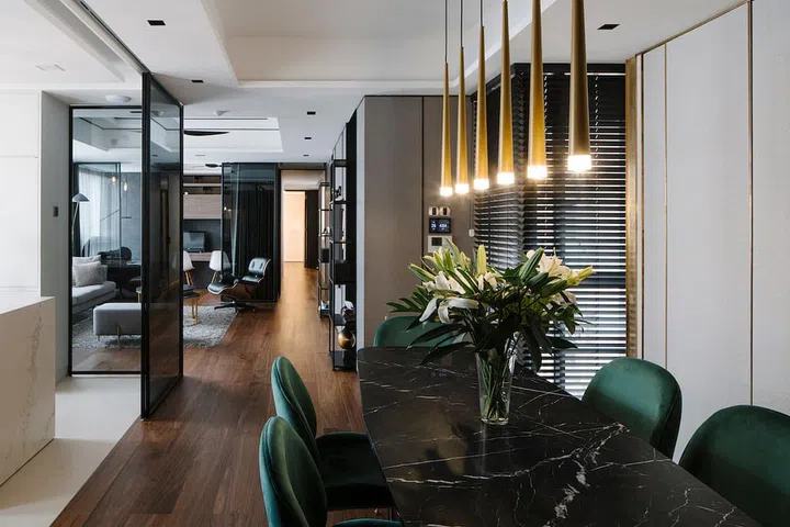 In this UE Residences home, interior design firm Laank used symmetry as well as clean lines to create a contemporary and masculine feel within the residence. Laank also lent a more masculine tone through their use of a dark wood, which was paired with the grey tones -- in the form of smoky tinted glass and wallpaper -- in the house.