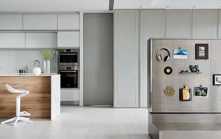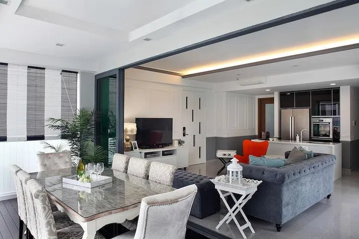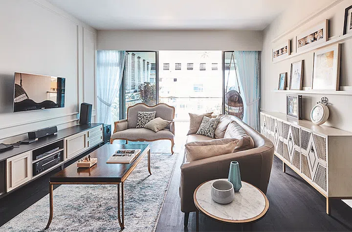 This four-bedroom condominium unit home was renovated by Black N White House, known for its signature elegant modern classic looks. In the living area, panelled walls and a chesterfield sofa infuse character into the space.