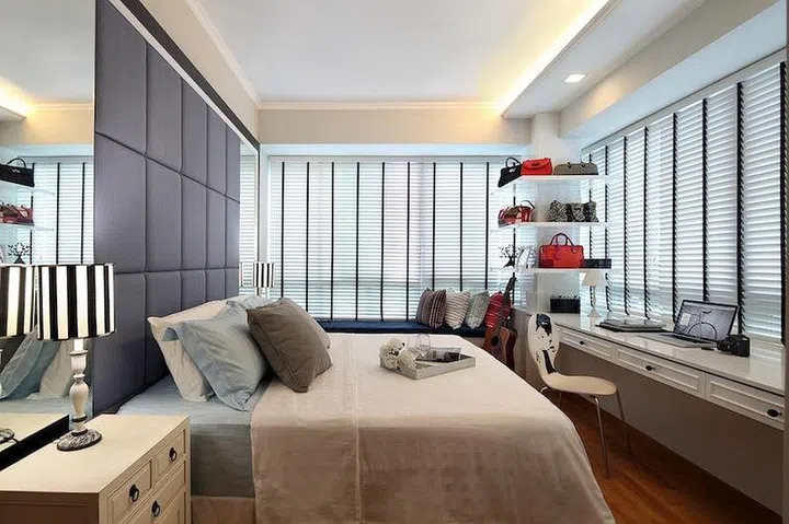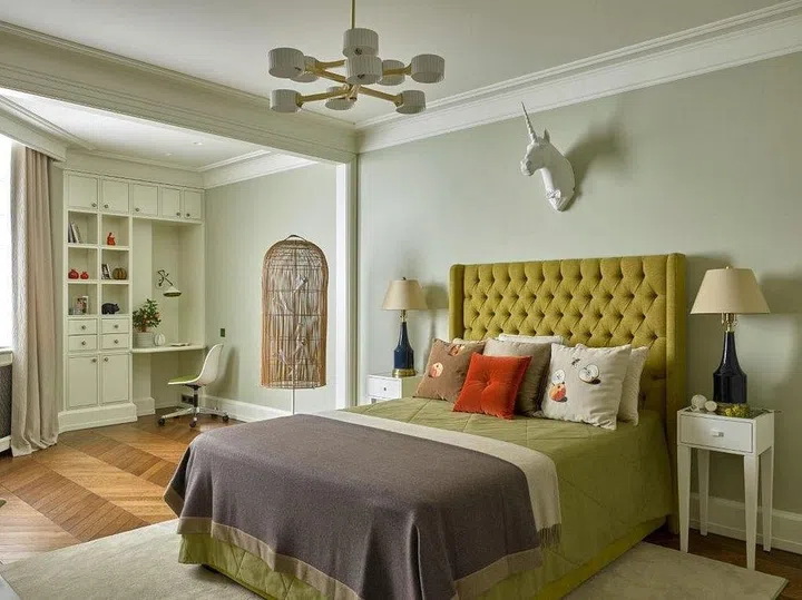 The master bedroom has a large upholstered panelled bed headboard — a quintessential classical feature that adds subtle luxury to the space.