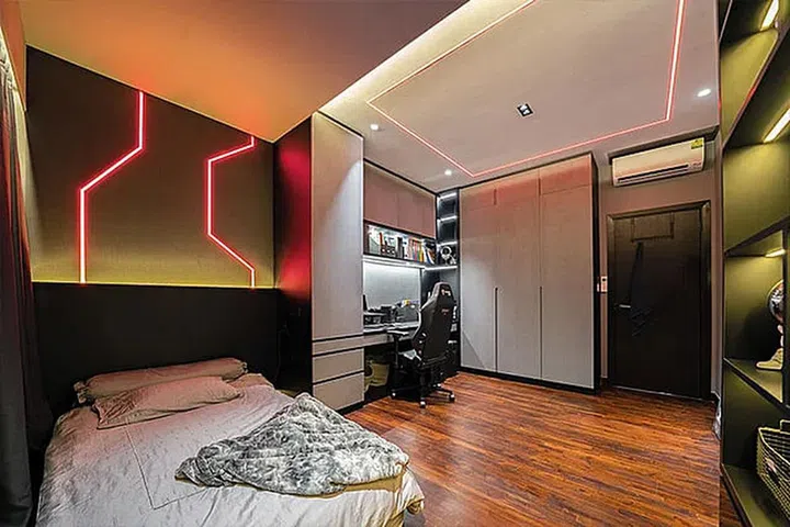 With its gaming-inspired design, the second bedroom is for the son. Bold straight lines have been carved into part of the ceiling and bedhead, which can be lit in any colour with special effects like pulses and flashes.