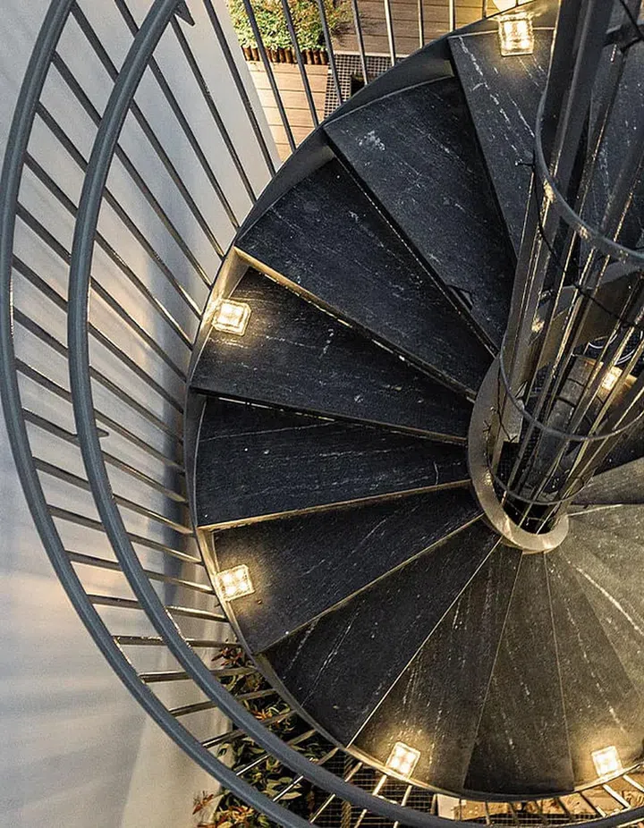 A spiral staircase connects the two, with unique glass cubes covering small solar-powered outdoor lights every few steps. Head up to the pavilion and discover a barbeque pit and ample seating facing Labrador Nature Reserve.