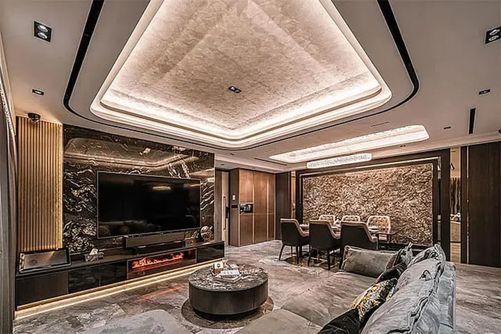 Visitors are wowed by a 2.8-metre feature wall that runs the length of the dining area just beyond the foyer after walking through the rather unobtrusive front door. Its whorls of grey and white are flecked with gold and resemble a contemporary Chinese ink painting. It is actually made up of three slabs of Italian marble that have been bookmatched.