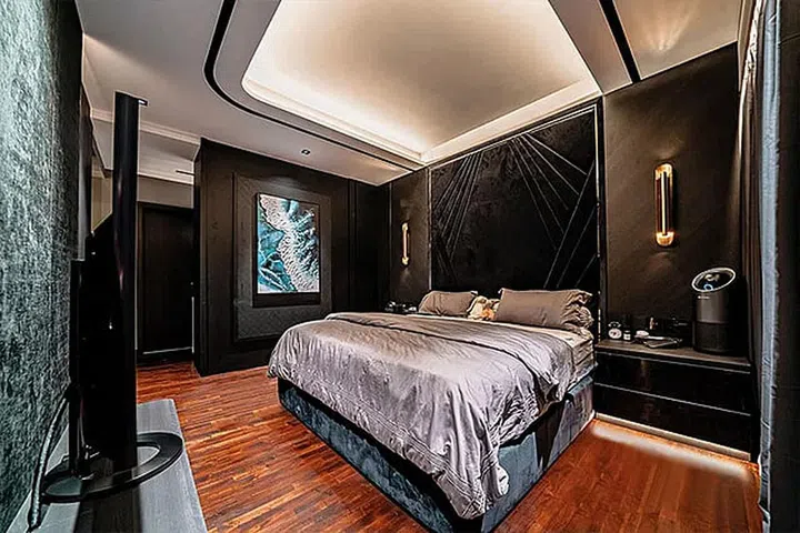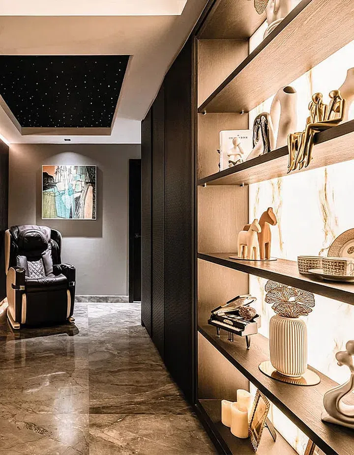The owner is an entrepreneur with a family of four, including an infant daughter and a primary school-aged son. Along with a luxurious home that could accommodate everyone comfortably, he also requested a darker colour scheme.