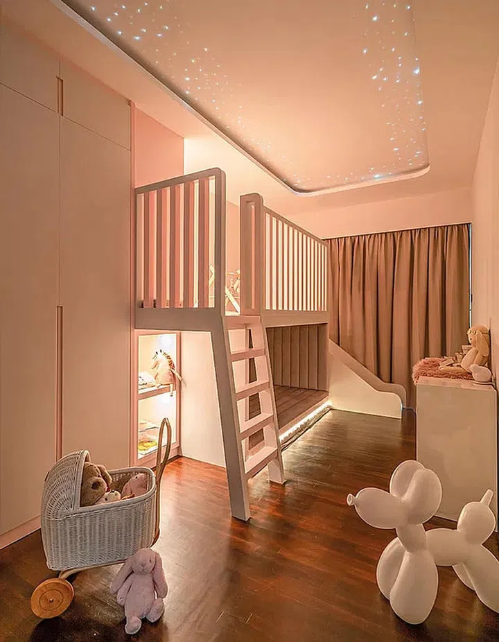 On the ceiling Wang points to the white pinpricks illuminating LED lights. “They’re meant to inspire the daughter to dream about reaching for the stars,” he quips.
