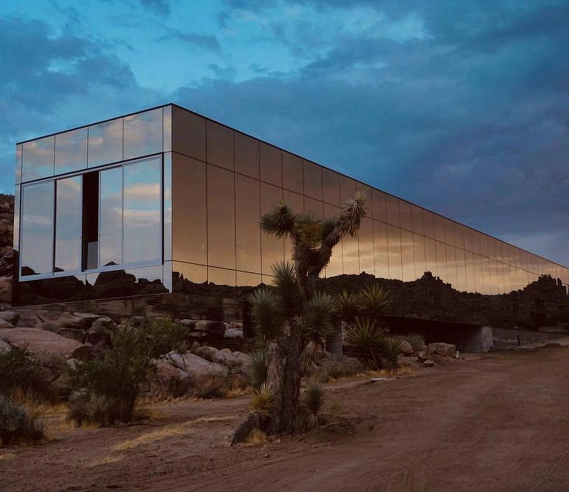 Inspired by the sci-fi classic 2001: A Space Odyssey, the home is a 5,500-square-foot mirrored box that reflects back the surrounding desert scenery and seems to blend into the landscape.
