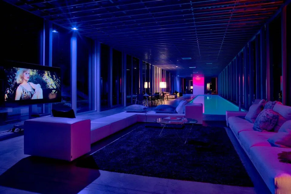 The glass walls open on three sides for a novel take on the indoor-outdoor living concept. Inside, a 100-foot (30m) heated indoor swimming pool is capped by a 224-square-foot projection wall perfect for screening films.