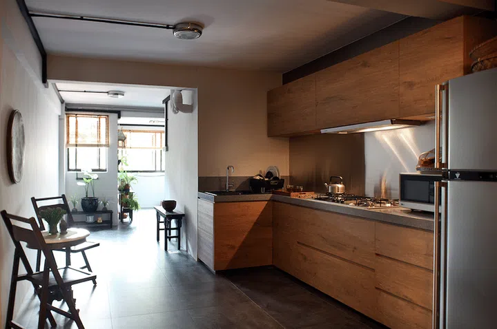 In this five-room HDB flat, which belongs to an interior designer, a long table was positioned in the middle of the dining-slash-kitchen area.