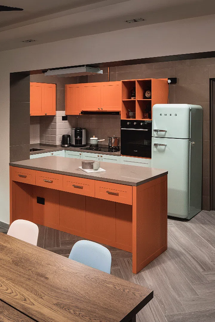 The homeowners of this five-room HDB home in Pine Close love to bake, and an open kitchen will allow the smell of fresh bakes to fill the house. As the owners were getting a mint Smeg fridge, it was important that the designer chose colours that will match it.