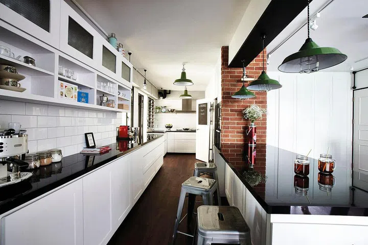 The kitchen of this 1,227sqf five-room HDB flat in Havelock is a stylish mix of colonial-meets-industrial chic. Exposed red-brick walls walls anchor the space, contrasting with the whitewashed cabinets, subway tiles, and black granite worktops.