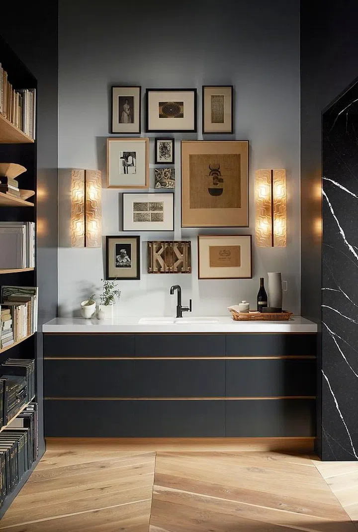 Tip #4: Don't just choose colours and materials you like, but those that complement each other well. "While the Marquina archway creates a tonal contrast within the space, the Pearl Jasmine countertop here complements the Calacatta Gold (white marble) on the back wall with more subtlety and nuance," she says.