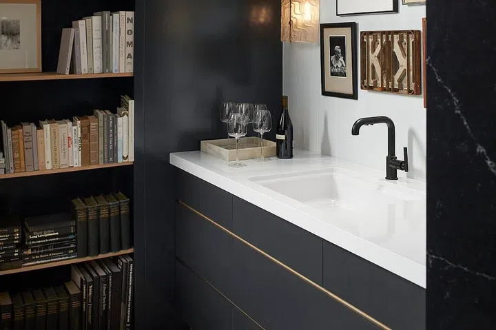 The kitchen features an archway, which Theresa cladded with Silestone's Marquina (take a better look at the next picture) -- a black-hued stone that "adds a hit of graphicness to the archway between the two spaces, making the transition particularly engaging."
