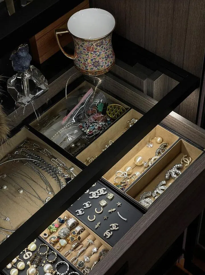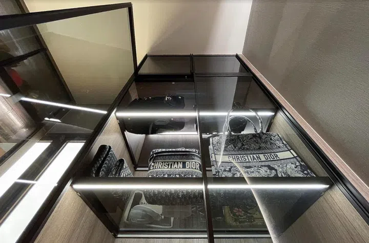 The second bedroom was transformed into a walk-in wardrobe, with indirect light radiating in, and a full dressing suite with both closed and exposed shelving for the collection of the owner’s designer bags. The subtle textured glass and sleek integrated door handles of the walk-in wardrobe celebrate the owner’s bag collection. Wood veneers were used on the custom carpentry, paired with thin custom fluorocarbon coated aluminium and custom patterned glass in the walk -in wardrobe enhancing the touch points of the home.