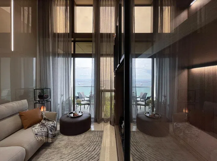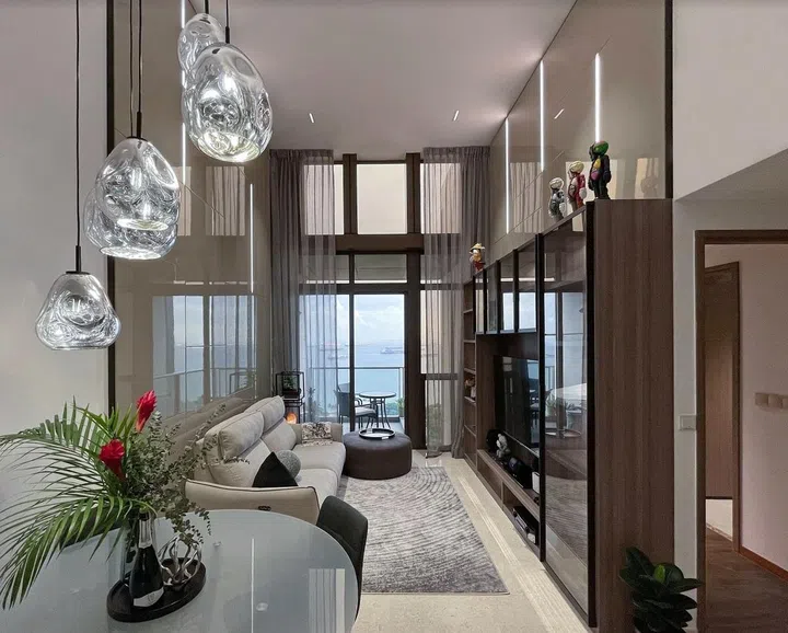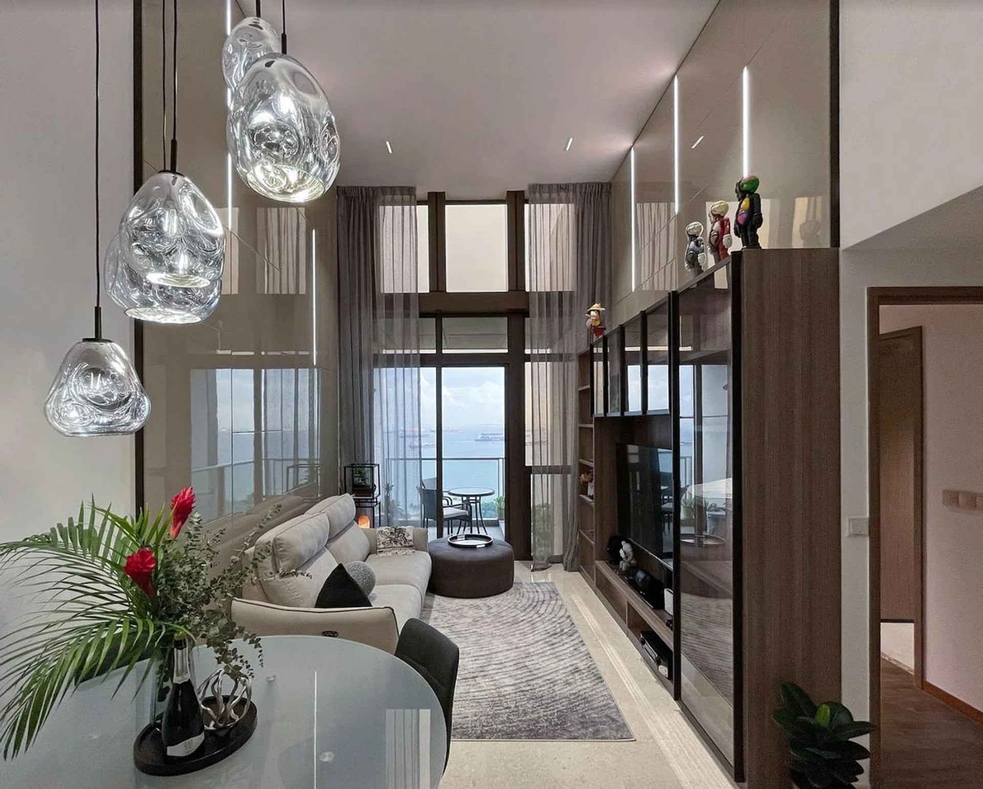 Along with the fantastic view, another plus of this apartment is its 4.5m high ceiling space. Simon began to conceive the look of the interiors by taking cues from the condo's exterior design developed by ADDP Architects, followed by incorporating the lofty ceiling space into his concept.