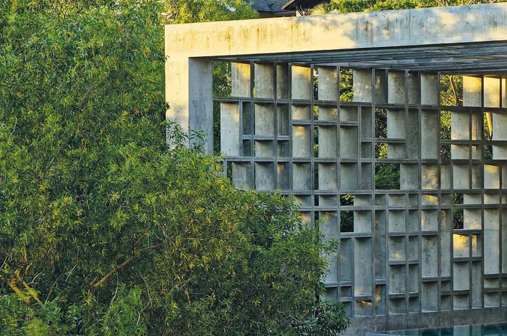 A concrete egg-crate structure was conceived so as to envelope the house to keep the heat out, while drawing daylight in to create comfortable spaces within.
