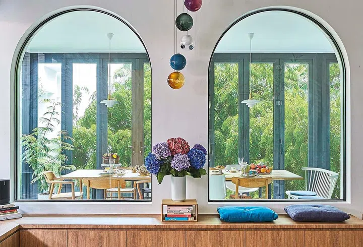 Under the arched openings facing the dining room at the side of the building and the tall windows towards the front is a built-in L-shaped bench with a bay window.