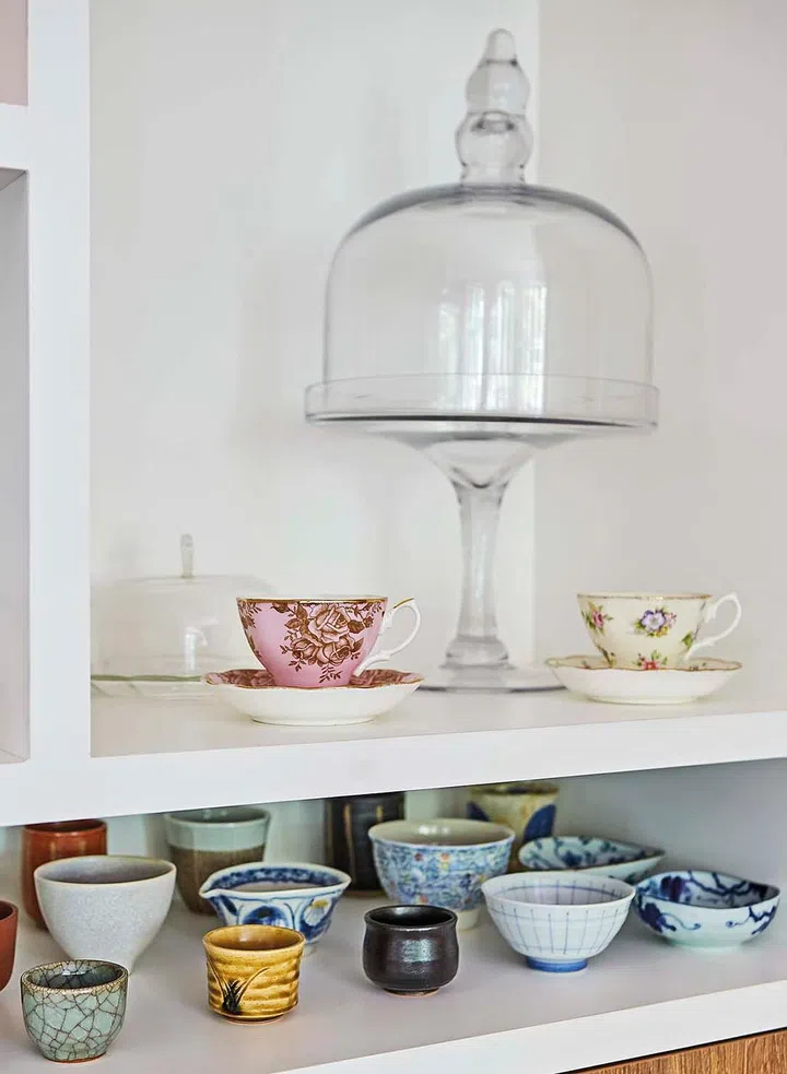 Anthony precisely determined what he wanted to put in the open shelves behind the living room and gave Dan specific dimensions, including the measurements for the cups.