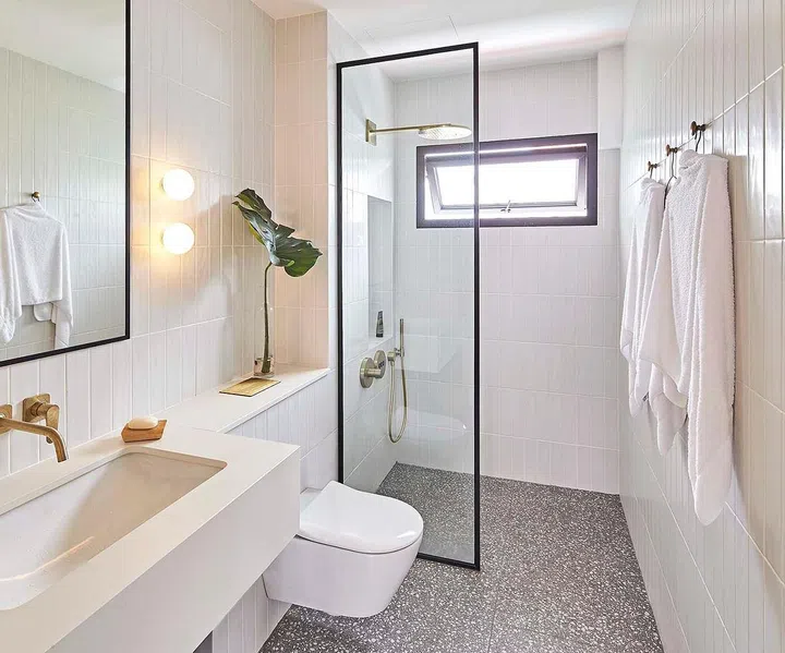 The attached bathroom follows the same design aesthetic with its grey terrazzo flooring and matte white subway wall tiles. An interior finished in neutral colours creates a calm atmosphere.