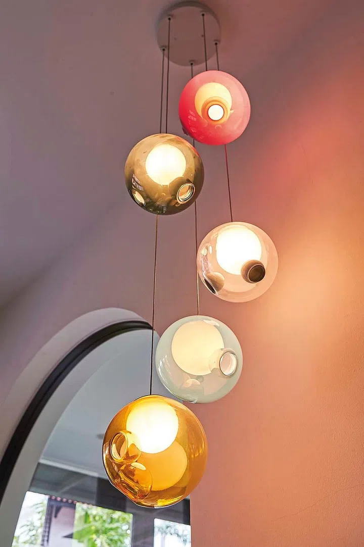 Bocci Series 28 pendant lights in mixed colours hang between two arched openings.