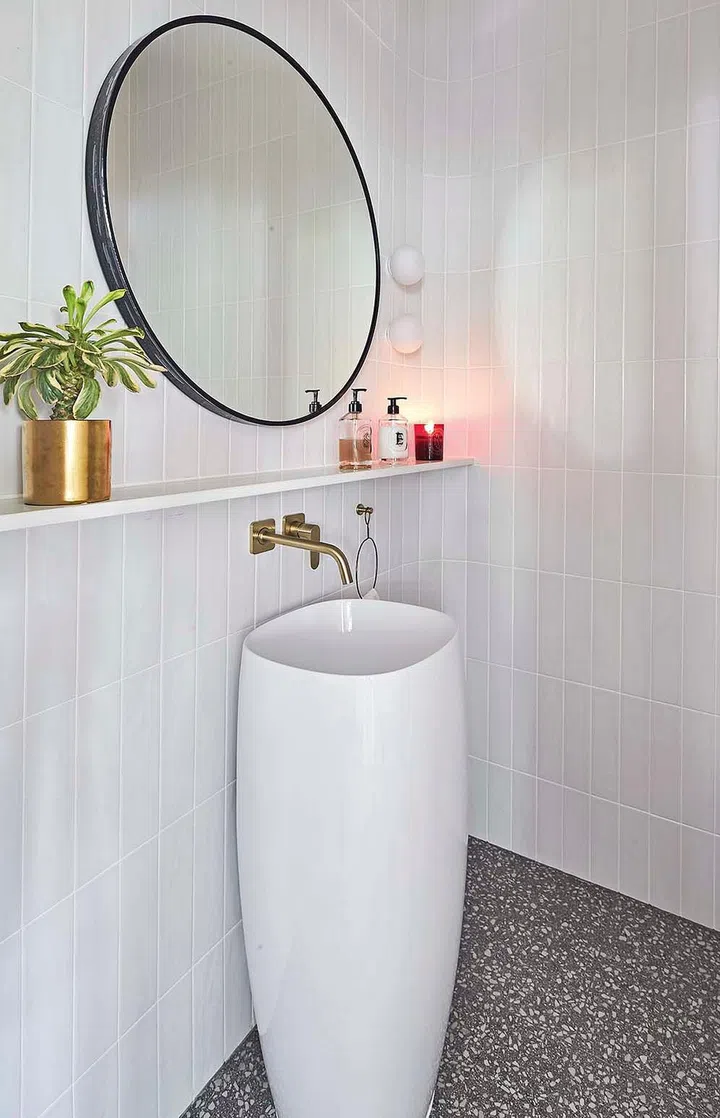 The powder room on the first storey continues the black and white theme from the adjacent dry kitchen.